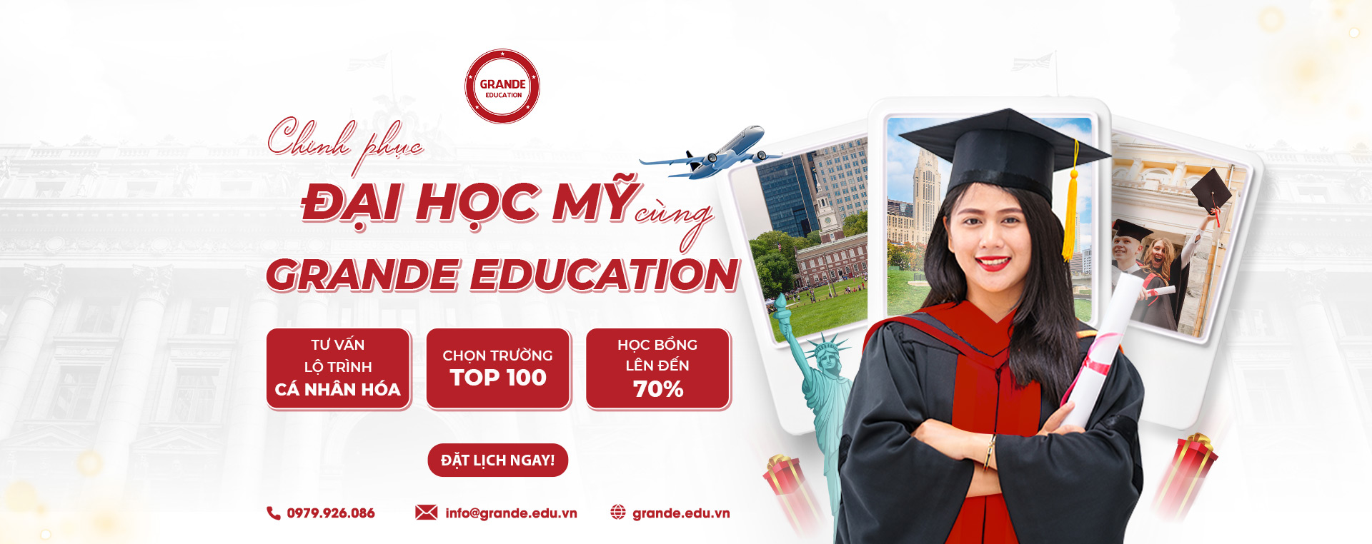 Với giá trị cốt lõi: “Tận tâm – Nỗ lực – Phát triển“ hết mình vì sự thành công của mỗi gia đình đến với Grande Education, chúng tôi tin rằng Grande Education là sự lựa chọn hàng đầu cho mong muốn một chuyên gia đồng hành xuyên suốt trên chặng đường thực hiện giấc mơ du học của học sinh.